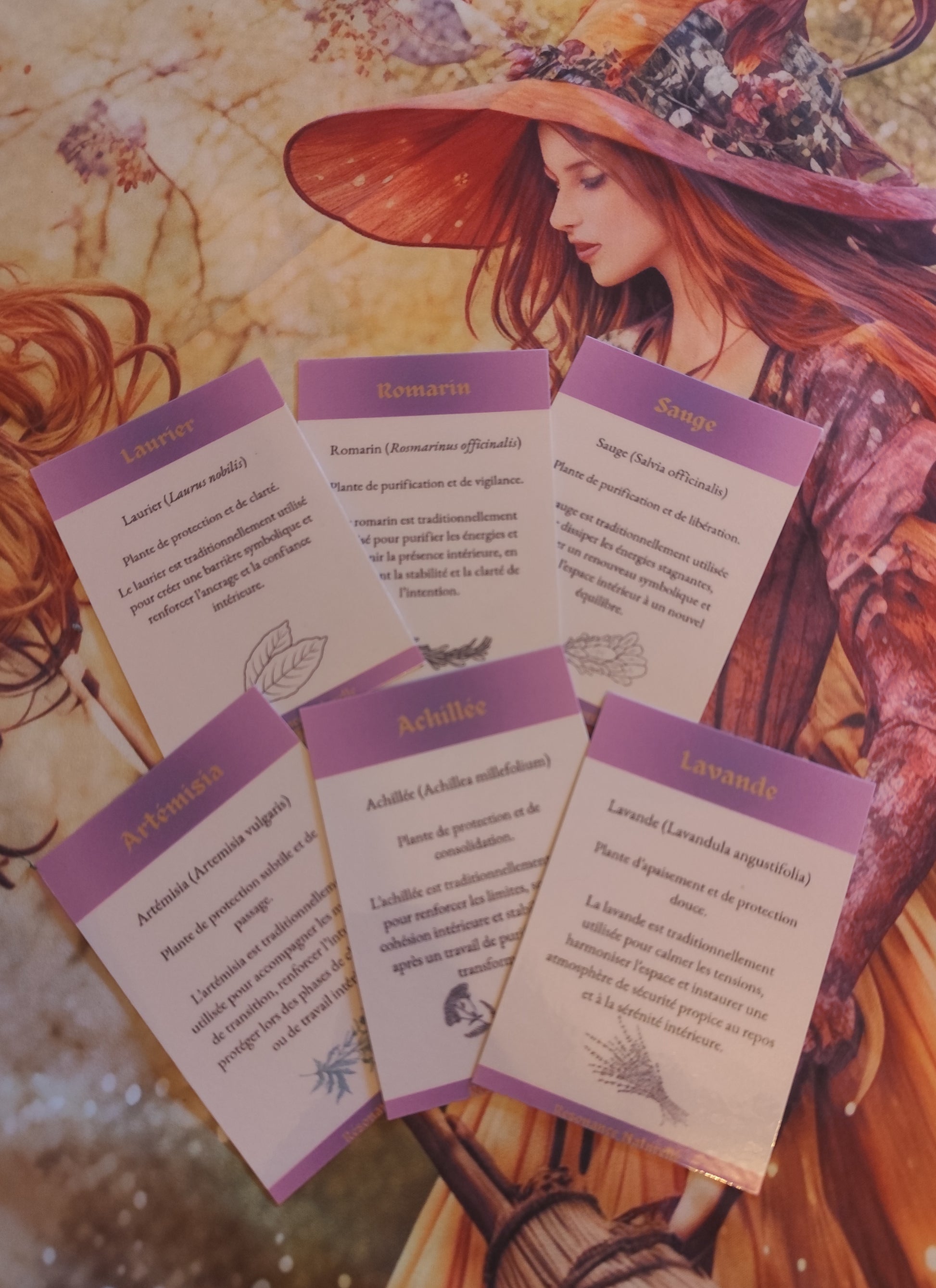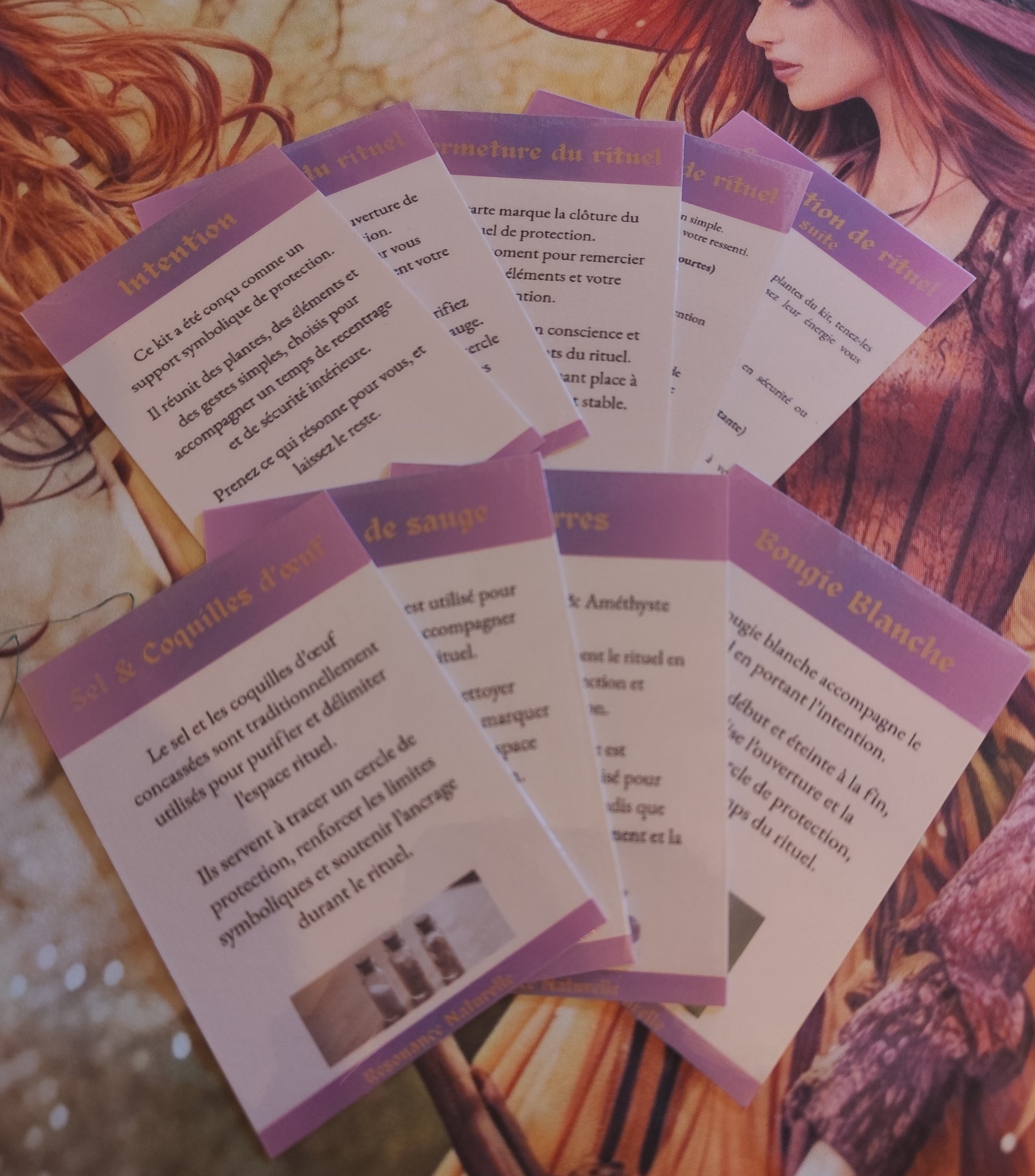 Les cartes fournies accompagnent pas à pas l’ouverture du rituel, l’utilisation des éléments et la fermeture du cercle, selon votre ressenti.